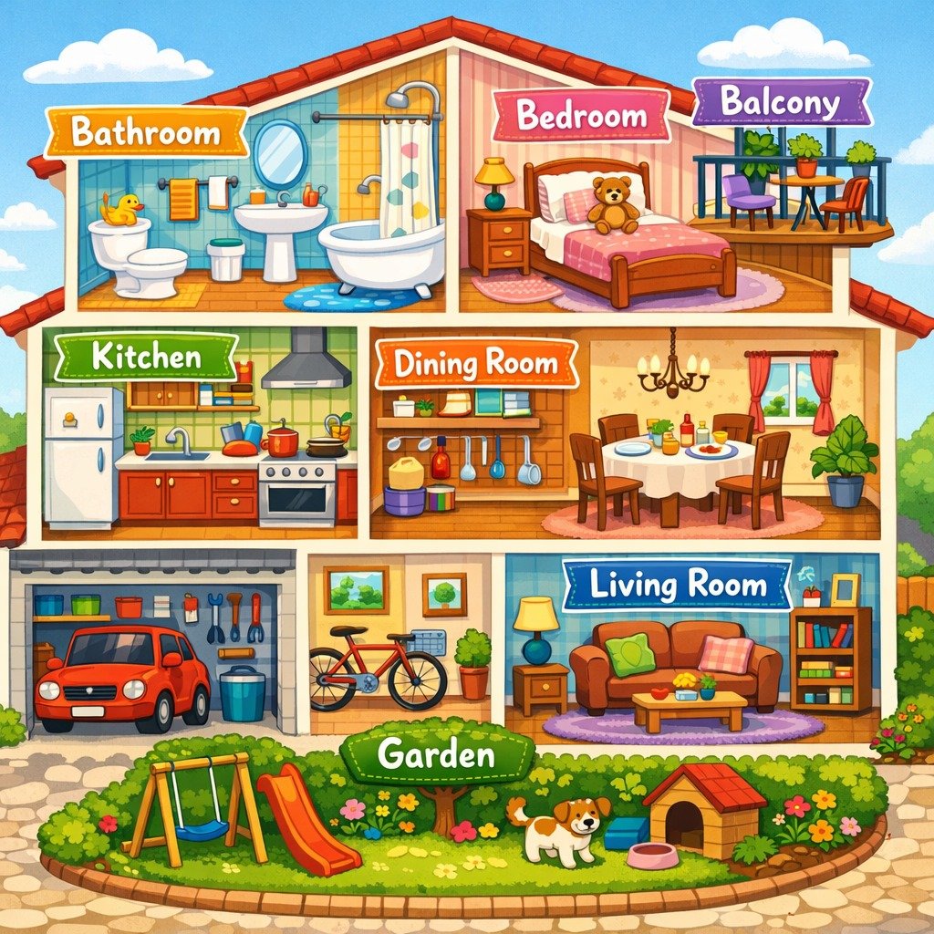 Ayudar a los niños a reconocer y nombrar las partes de la casa en inglés utilizando la frase “This is…”.